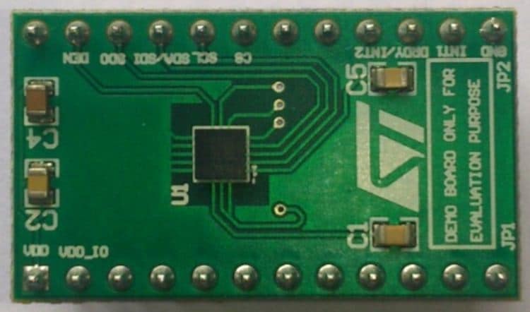 The STEVAL-MKI136V1 can be plugged into a standard DIL 24 socket. The adapter provides the complete L3GD20H pinout and comes ready-to-use with the required decoupling capacitors on the VDD power supply line.