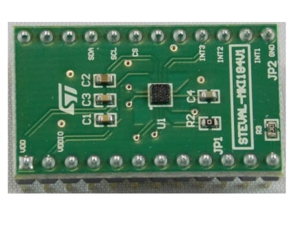 The STEVAL-MKI184V1 can be plugged into a standard DIL 24 socket. The adapter provides the complete ISM303DAC pinout and comes ready-to-use with the required decoupling capacitors on the VDD power supply line.