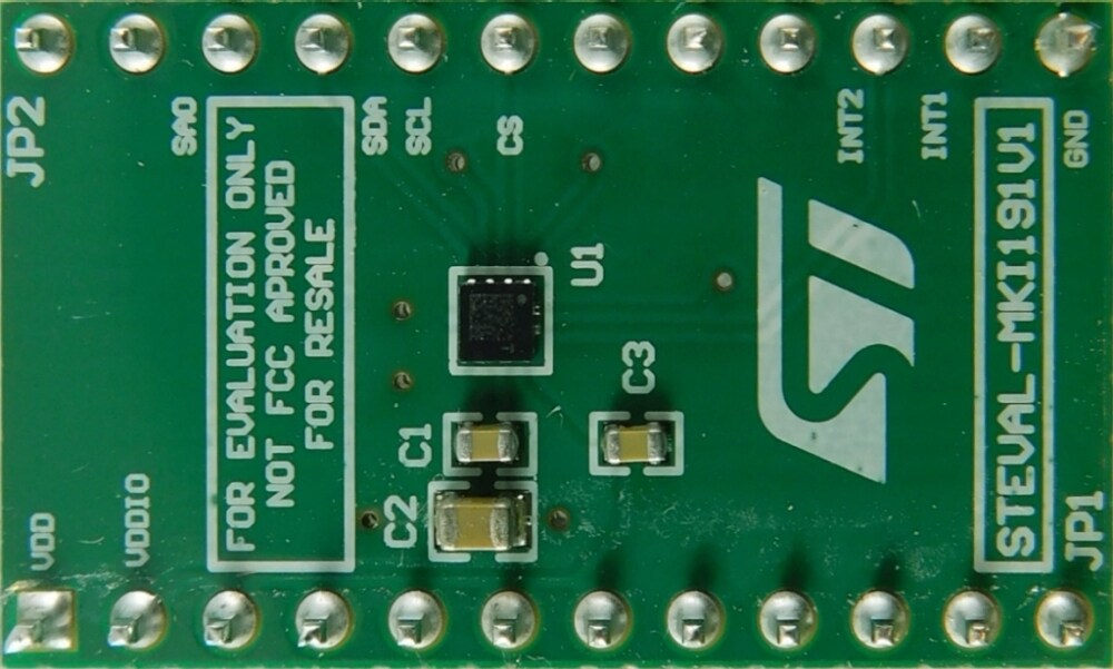 The STEVAL-MKI191V1 can be plugged into a standard DIL24 socket. The adapter provides the complete IIS2DLPC pinout and comes ready to use with the required decoupling capacitors on the VDD power supply line.