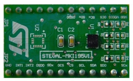 The STEVAL-MKI195V1 can be plugged into a standard DIL 24 socket. The adapter provides the complete LSM6DSRX pin-out and comes ready-to-use with the required decoupling capacitors on the VDD power supply line.