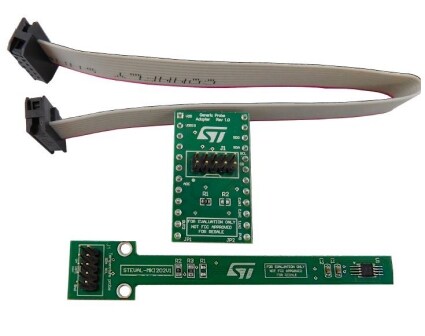 The STEVAL-MKI202V1K evaluation kit consists of a probe with the STDS75 temperature sensor connected via flat cable to the STEVAL-MKIGIBV1 adapter board, so it can interface with the STEVAL-MKI109V3.