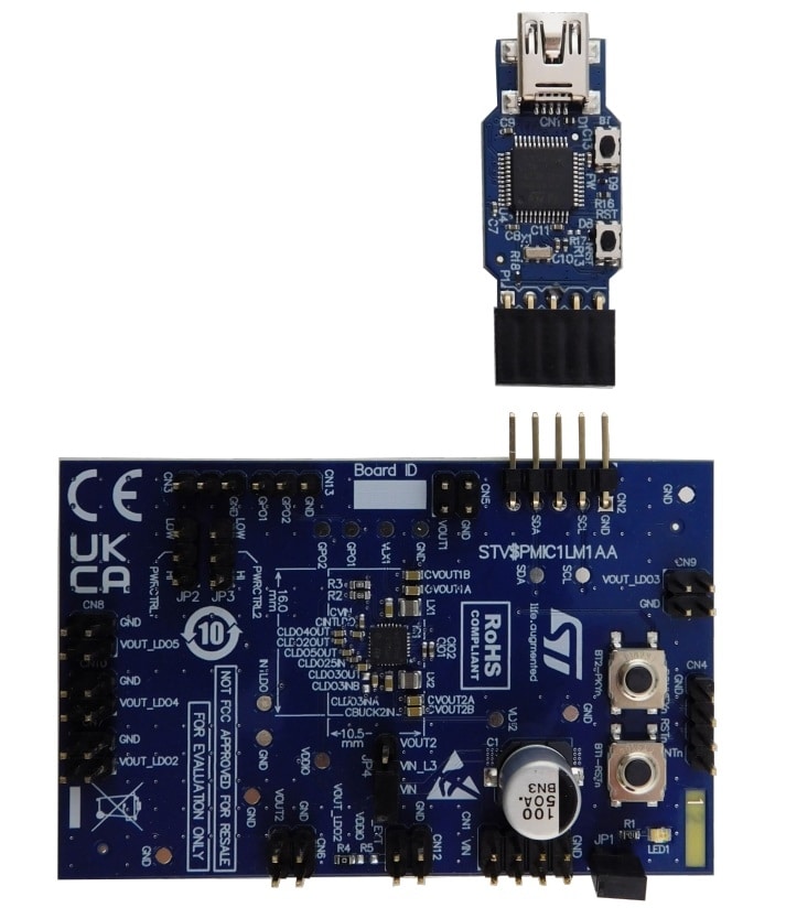 The STEVAL-PMIC1LKV1 is a power evaluation kit made by a STEVAL-PMIC1LM1A evaluation board and a STEVAL-USBDNGV1 USB dongle.