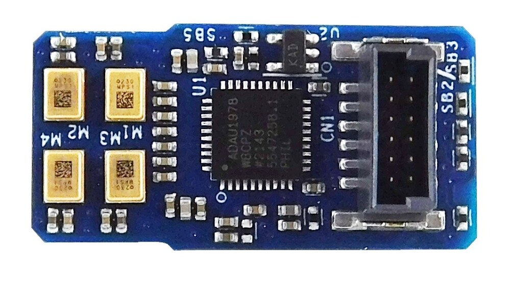 - Four IMP23ABSU high-performance, single-ended, analog, bottom-port MEMS microphones