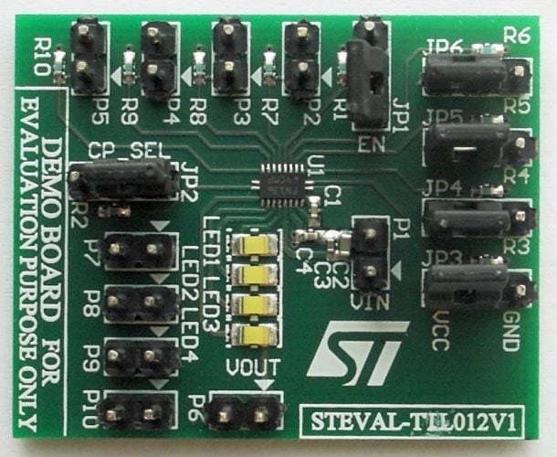 The STEVAL-TLL012V1 demonstration board demonstrates the performance of the STP4CMP, a charge pump based 4-channel LED driver designed for RGB illumination or LCD display backlighting.