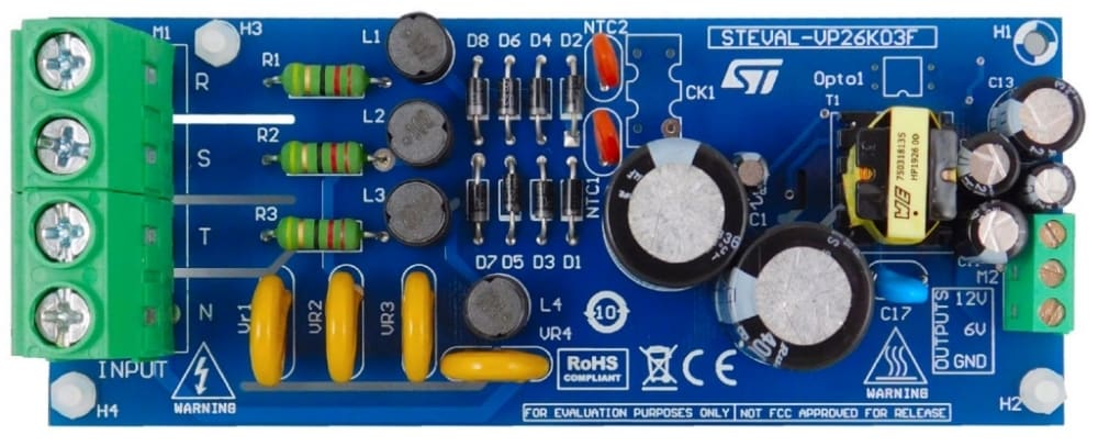 The STEVAL-VP26K03F evaluation board implements a double output isolated flyback with primary side regulation (PSR), specifically designed to supply smart meter and PLC systems.