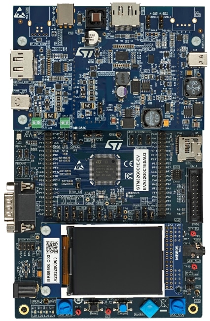 The full range of hardware features on the STM32G0C1E-EV Evaluation board includes the mother board, the legacy peripheral daughterboard, and the USB-C® and Power Delivery daughterboard, which help to develop applications, and evaluate all peripherals, such as USB Type-C® connector with USB PD, motor control connector, CAN FD, USB 2.0 FS, RS-232, RS-485, audio DAC, microphone ADC, TFT LCD, IrDA, IR LED, IR receiver, LDR, microSD™ card, CEC on two HDMI connectors, Smartcard slot, RF EEPROM, and temperature sensor.