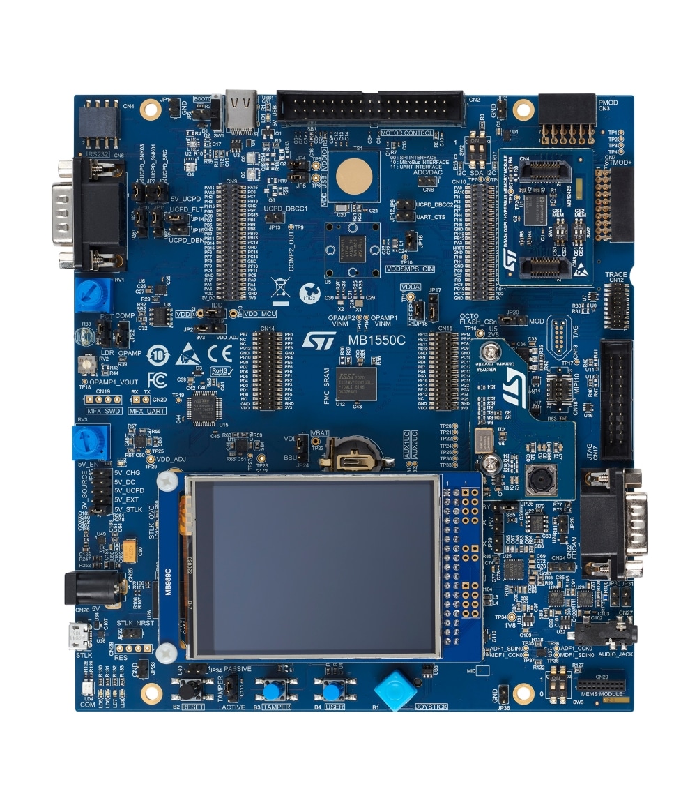 STM32U575I-EV评估板集成了丰富的硬件外设,帮助用户开发应用并全面评估各种外设功能,包括USB Type-C®(支持USB PD)、电机控制连接器、CAN FD收发器、USB 2.0 FS、RS-232、音频DAC、麦克风ADC、点阵TFT LCD、IrDA、IR LED、IR接收器、LDR、SRAM、摄像头接口、Octo-SPI Flash存储器、microSD™卡、Σ-Δ调制器、智能卡插槽、I²C和EEPROM。