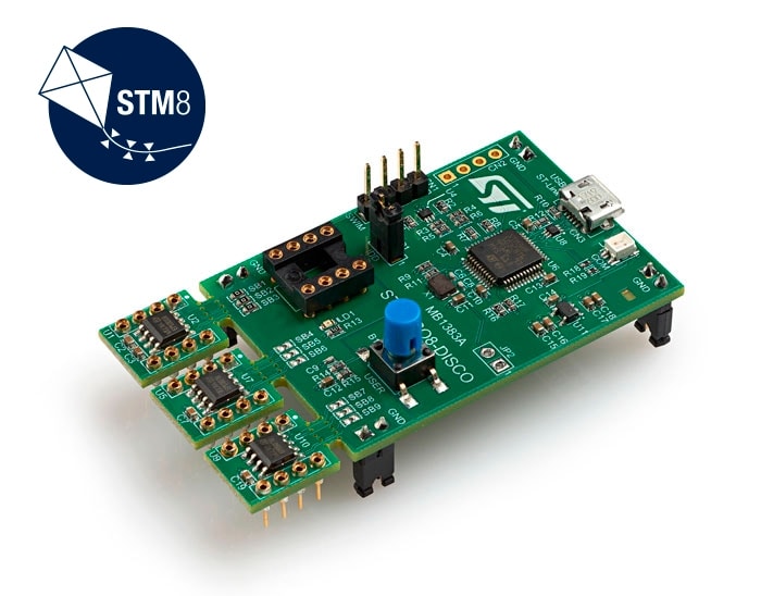 The STM8-SO8-DISCO helps to discover features of STM8S Value Line and STM8L Value Line devices available in SO8 packages. This discovery kit offers three SO8 to DIL8 modules designed with STM8S001J3M3, STM8L001J3M3 and STM8L050J3M3 microcontrollers, and allows the user to easily develop and share applications. It includes an on-board ST-LINK/V2 to debug and program any of the embedded STM8 microcontrollers, or even an external target by means of a SWIM connector.