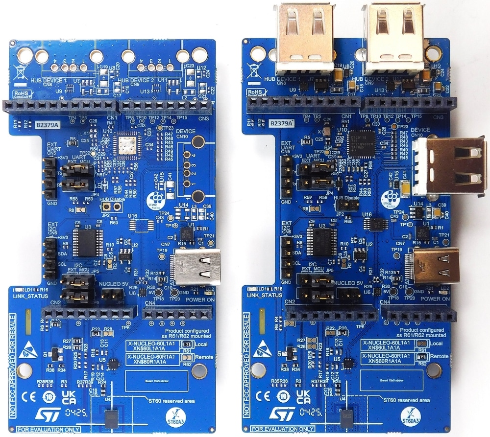 X-NUCLEO-60K1A1套件由两块扩展板组成,包括X-NUCLEO-60L1A1扩展板和X-NUCLEO-60R1A1扩展板,两者配对使用,可插入配备Arduino R3连接器的大多数STM32 Nucleo板。该套件提供完整的评估工具,帮助用户学习、评估和开发基于ST60A3H1收发器的应用,实现高达480 Mbit/s的非接触式连接。