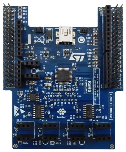 The X-NUCLEO-AMICAM1 embeds three MP23ABS1 microphones: two connected to an external ADC and one directly routed to the STM32 embedded ADC.