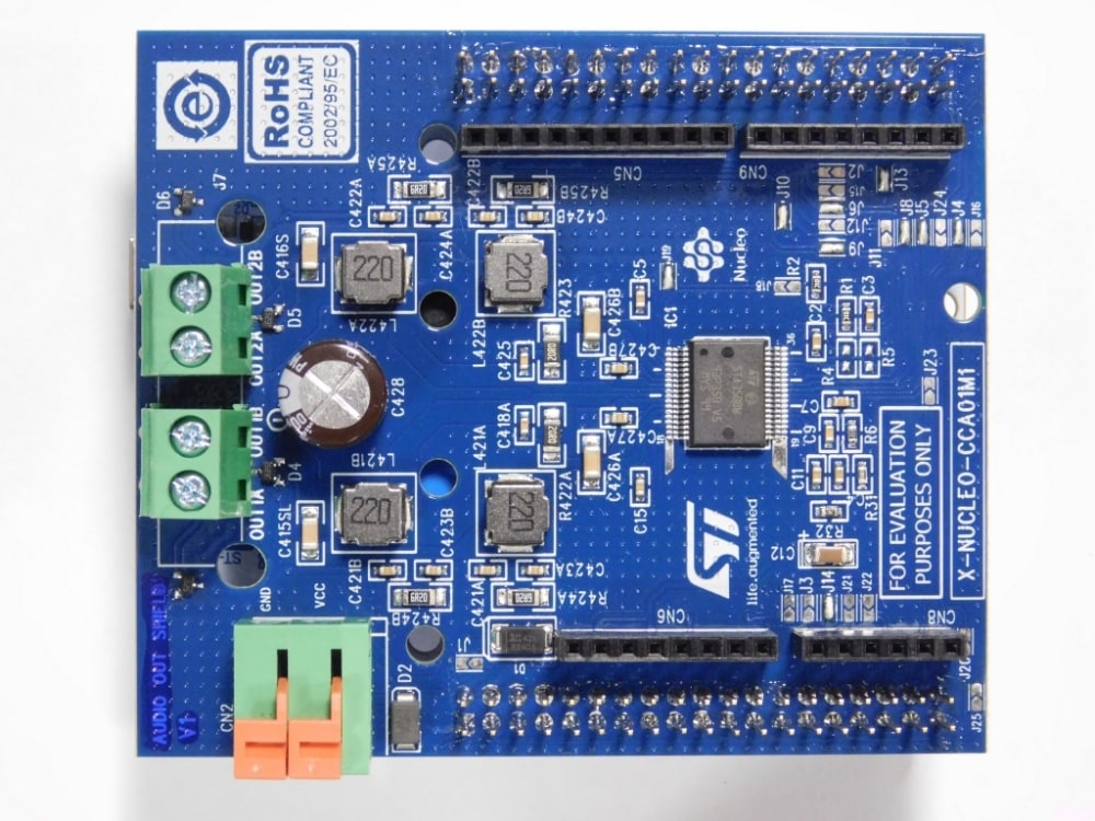 The X-NUCLEO-CCA01M1 is an expansion board based on the STA350BW Sound Terminal® 2.1-channel high-efficiency digital audio output system.