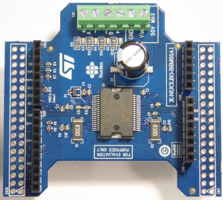 The X-NUCLEO-IHM05A1 is a bipolar stepper motor driver expansion board based on the L6208 driver for bipolar stepper motors. It provides an affordable and easy-to-use solution for driving bipolar stepper motors in STM32 Nucleo projects. The X-NUCLEO-IHM05A1 is compatible with the Arduino UNO R3 connector, and supports the addition of other STM32 expansion boards with a single STM32 Nucleo board. The user can also mount the ST Morpho connector.
