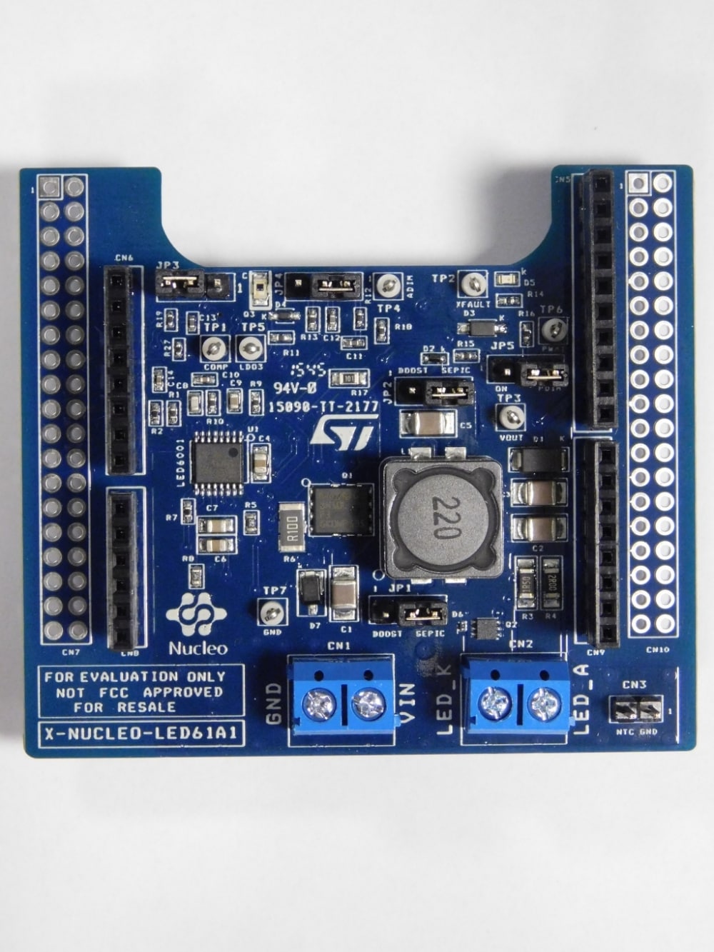 The X-NUCLEO-LED61A1 is an expansion board designed to provide a sample application for the compact LED driver based on LED6001. The expansion board is equipped with a single-channel, constant-current LED driver for boost or SEPIC topologies.The X-NUCLEO interfaces with the STM32 microcontroller. It is compatible with the Arduino™ UNO R3 connector.