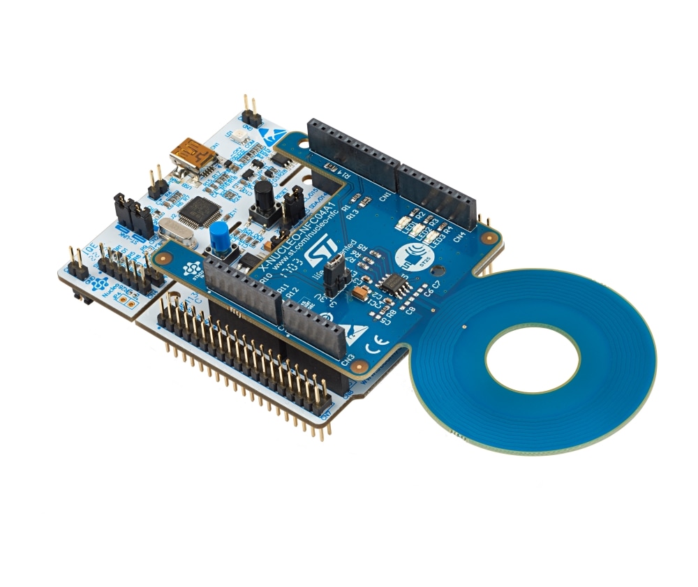 The X-NUCLEO-NFC04A1 expansion board is compatible with the Arduino™ UNO R3 connector pin assignment and can easily be plugged onto any STM32 Nucleo board. Various expansion boards can also be stacked to evaluate different devices operating together with the dynamic NFC tag. The board also features an antenna with a 54 mm ISO 24.2 diameter, single layer, copper etched on PCB.