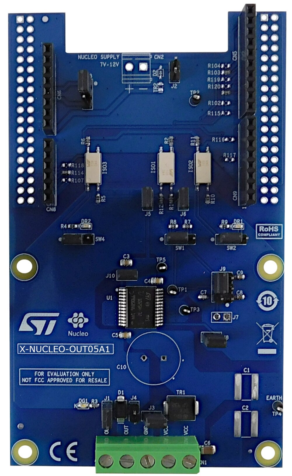 X-NUCLEO-OUT05A1工业数字输出扩展板为STM32 Nucleo提供强大而灵活的环境,适用于评估IPS1025H单通道高边智能功率固态继电器在连接2.5 A工业负载的数字输出模块中的驱动和诊断能力。