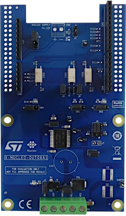 X-NUCLEO-OUT06A1工业数字输出扩展板为STM32 Nucleo提供强大而灵活的环境,适用于评估IPS1025H-32单通道高边智能功率固态继电器在连接5.7 A工业负载的数字输出模块中的驱动和诊断能力。