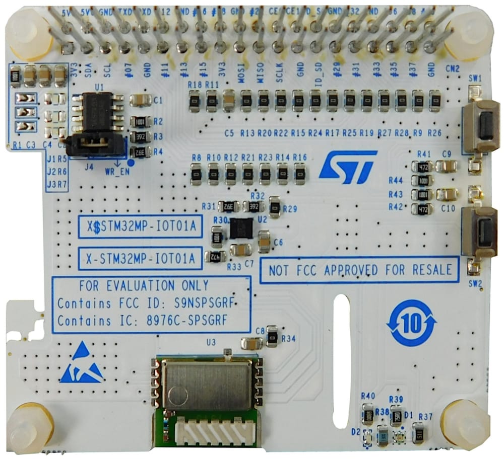 The X-STM32MP-IOT01A is an STM32 MPU expansion board with the SPSGRF-915 SPIRIT1 RF module for Sub-1 GHz RF communication with sensor, for IoT applications.