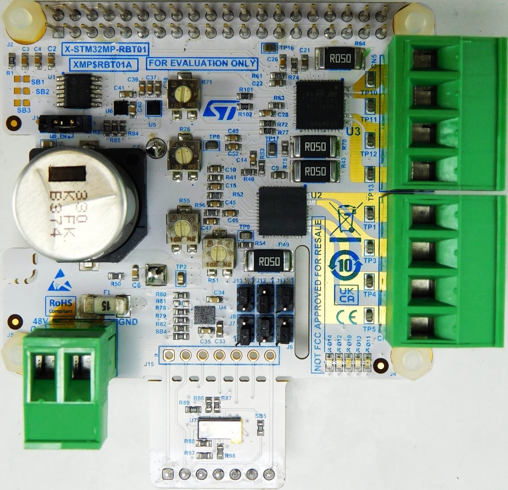 X-STM32MP-RBT01是一款带有STSPIN948电机驱动器IC的MPU扩展板,适用于有刷直流电机。借助两个STSPIN948器件,该扩展板可同时驱动四个直流电机,供电电压最高可达48 V。