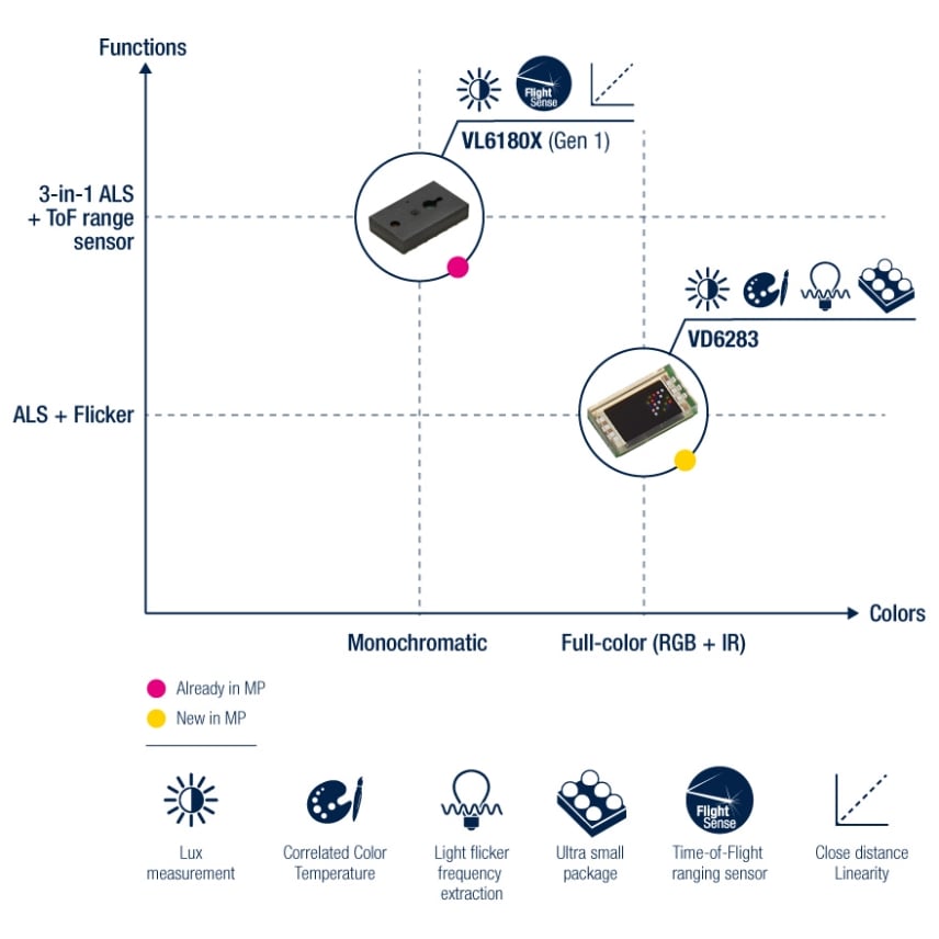 我们的VL6180X可将环境光传感器(ALS)、渡越时间(ToF)测距传感器,以及红外发射器组合在单一模块中,此外意法半导体还新推出VD6283TX,一种具有高级光闪烁频率提取功能的微型全彩色传感器。