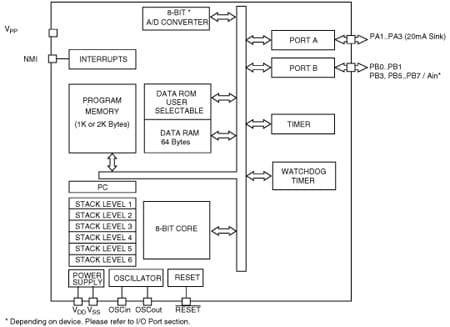 These compact low-cost devices feature a Timer comprising an 8-bit counter with a 7-bit programmable prescaler, an 8-bit A/D Converter with 4 analog inputs (depending on device, see device summary on page 1) and a Digital Watchdog timer, making them well suited for a wide range of automotive, appliance and industrial applications.