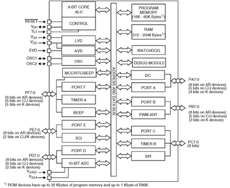 Main Clock Controller with: Real time base, Beep and Clock-out capabilities Configurable watchdog timer Two 16-bit timers with: 2 input captures, 2 output compares, external clock input on one timer, PWM and pulse generator modes 8-bit PWM Auto-reload timer with: 2 input captures, 4 PWM outputs, output compare and time base interrupt, external clock with event detector - Instruction set