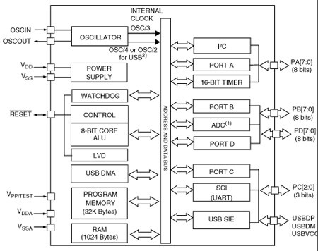 4, 8, 16 or 32 Kbytes program memory: high density Flash (HDFlash), FastROM or ROM with Read-Out and Write protection In-application programming (IAP) and in-circuit programming (ICP) 384, 512 or 1024 bytes RAM memory (128-byte stack) - USB (universal serial bus) Interface
