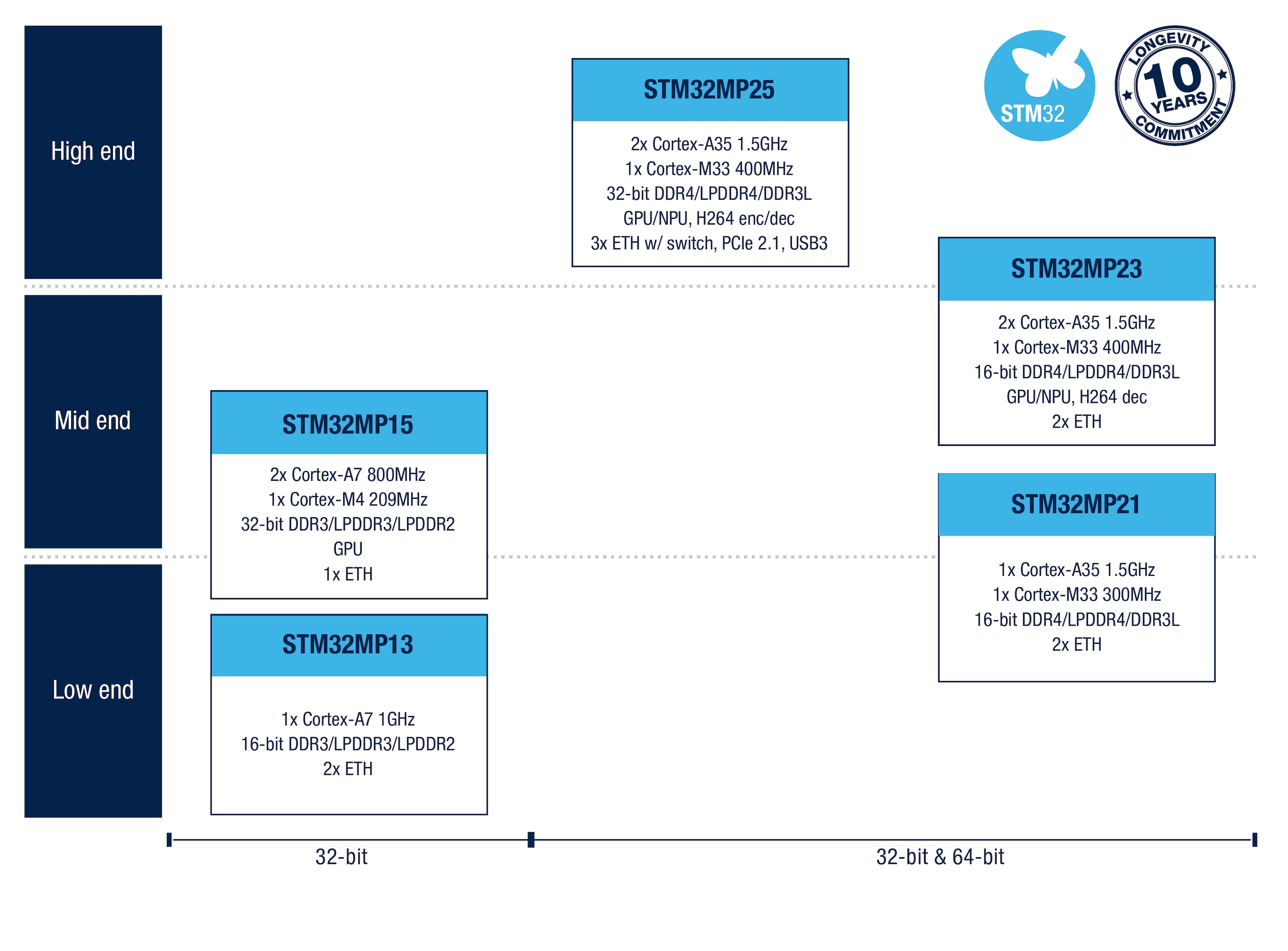 The STM32 family of general-purpose 32-bit microprocessors (MPUs) provides developers with greater design flexibility and performance. STM32 application processors are based on single or dual Arm Cortex®-A cores, combined with Cortex®-M33 and M0+ cores. From cost-effective, single-core MPUs to more advanced, multicore MPUs, ST offers a scalable approach to help developers find the right fit.