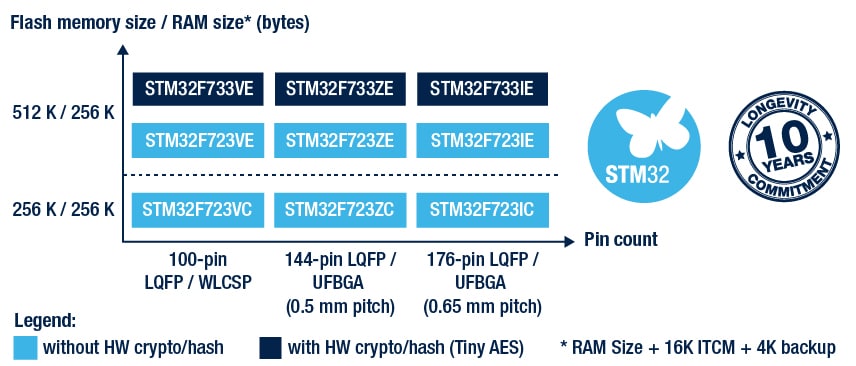 STM32F7x3系列提供多种型号,256到512 KB的Flash存储器以及最大256 KB的SRAM,包括最大64 KB的紧密耦合数据存储器(DTCM)、16 KB的紧密耦合指令存储器(ITCM)、4 KB的备份RAM,采用100到176引脚封装。