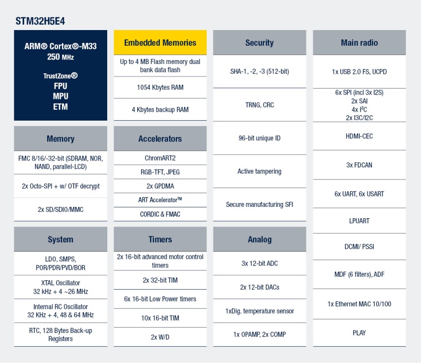 The STM32H5Exxx devices are high-performance microcontrollers of the STM32H5 series, based on the high-performance Arm® Cortex®-M33 32-bit RISC core. They operate at a frequency of up to 250 MHz.