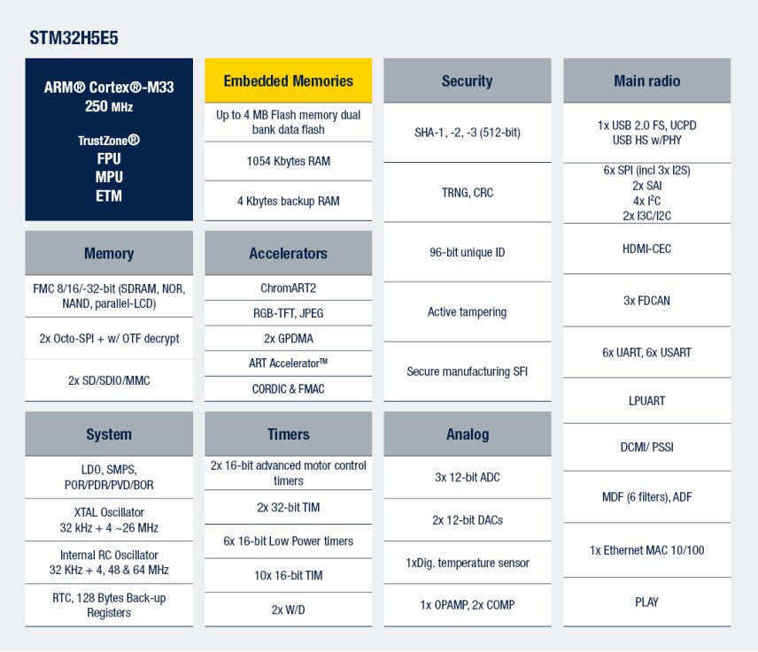 The STM32H5Exxx devices are high-performance microcontrollers of the STM32H5 series, based on the high-performance Arm® Cortex®-M33 32-bit RISC core. They operate at a frequency of up to 250 MHz.