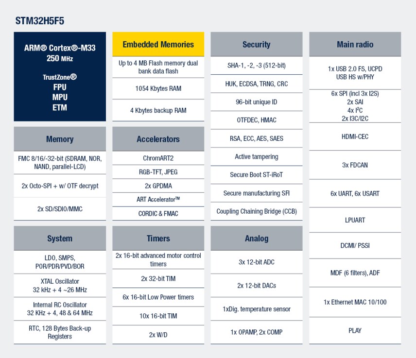 The STM32H5Fxxx devices are high-performance microcontrollers of the STM32H5 series, based on the high-performance Arm® Cortex®-M33 32-bit RISC core. They operate at a frequency of up to 250 MHz.