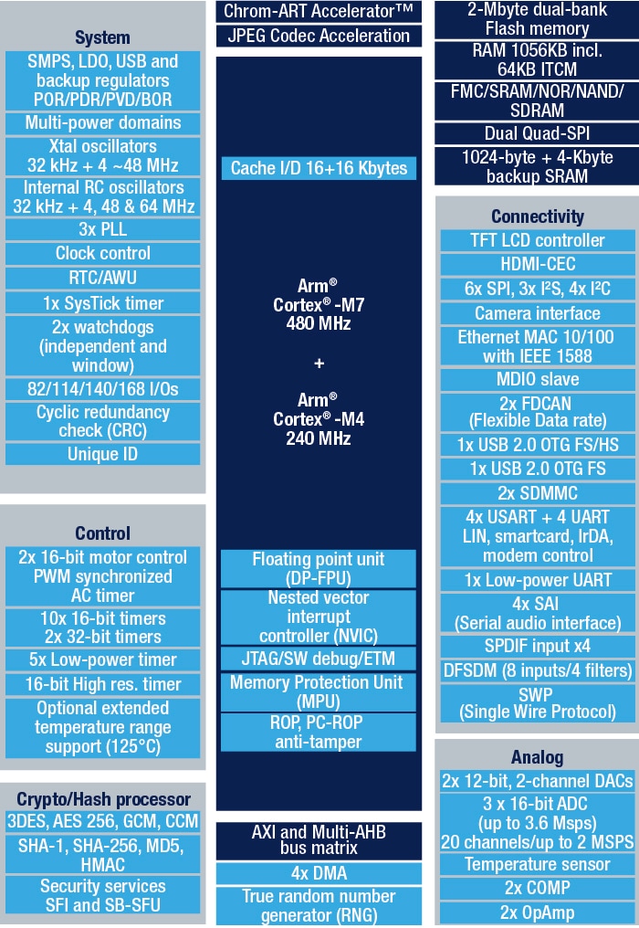 - 32-bit Arm® Cortex®-M7 core with double-precision FPU and L1 cache: 16 Kbytes of data and 16 Kbytes of instruction cache; frequency up to 480 MHz, MPU, 1027 DMIPS/ 2.14 DMIPS/MHz (Dhrystone 2.1), and DSP instructions