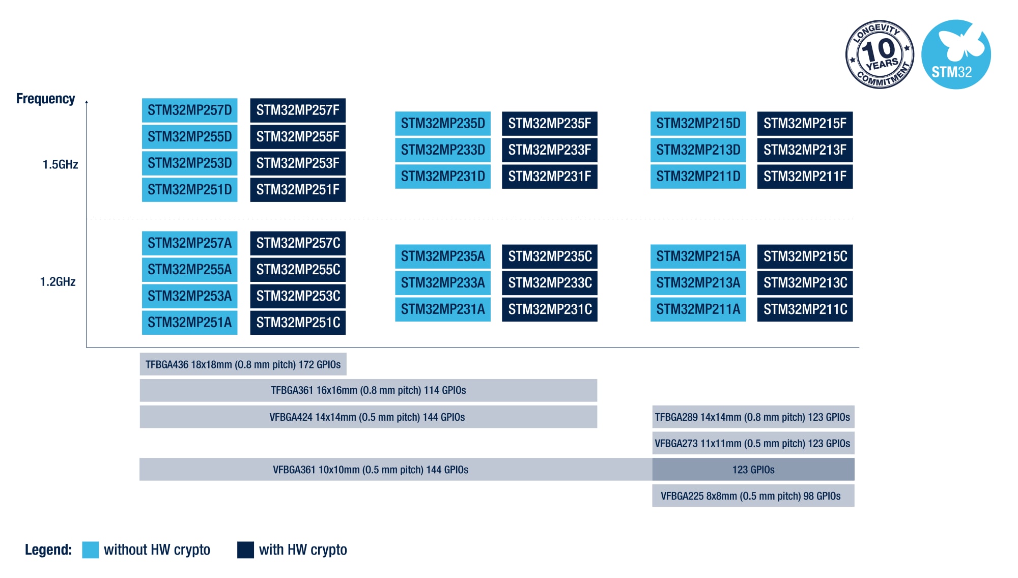 STM32MP2提供7种封装类型,尺寸从18x18 mm到8x8 mm不等,支持多种间距规格,且支持宽结温范围(-40 °C至125 °C),特别适合需要长期可靠性的工业及恶劣环境。