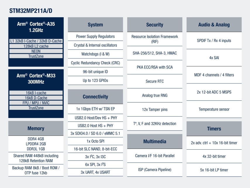 STM32MP21xA/D devices are based on the high-performance core Arm® Cortex®-A35 64-bit RISC core operating at up to 1.5 GHz. The Cortex®‑A35 processor includes a 32-Kbyte L1 instruction cache, a 32-Kbyte L1 data cache, and a 128-Kbyte L2 cache. The Cortex®‑A35 processor uses a highly efficient 8-stage in-order pipeline that has been extensively optimized to provide full Armv8-A features while maximizing area and power efficiency.