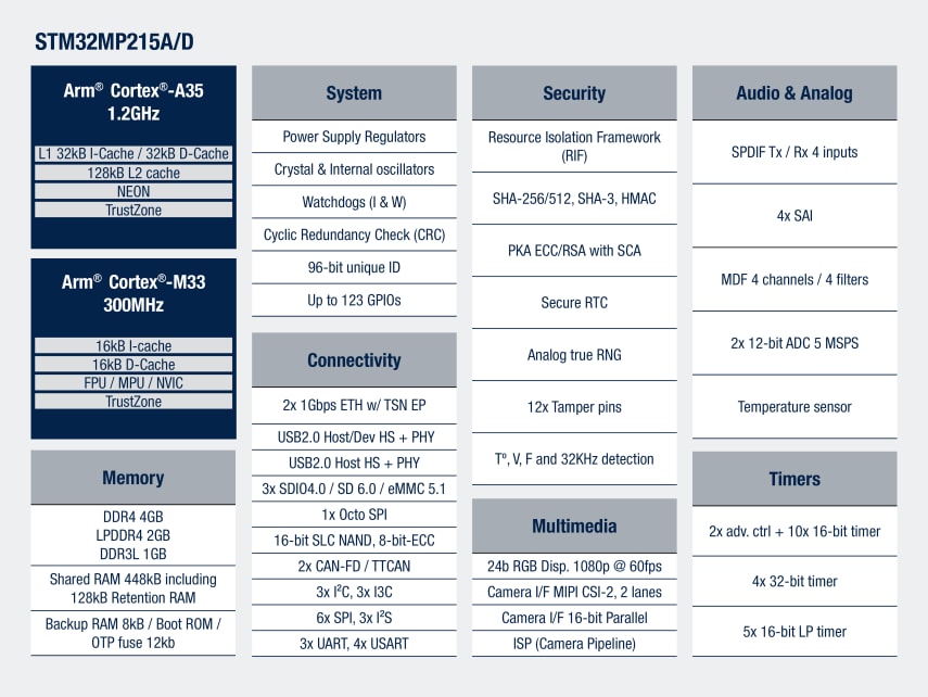 STM32MP21xA/D devices are based on the high-performance core Arm® Cortex®-A35 64-bit RISC core operating at up to 1.5 GHz. The Cortex®‑A35 processor includes a 32-Kbyte L1 instruction cache, a 32-Kbyte L1 data cache, and a 128-Kbyte L2 cache. The Cortex®‑A35 processor uses a highly efficient 8-stage in-order pipeline that has been extensively optimized to provide full Armv8-A features while maximizing area and power efficiency.