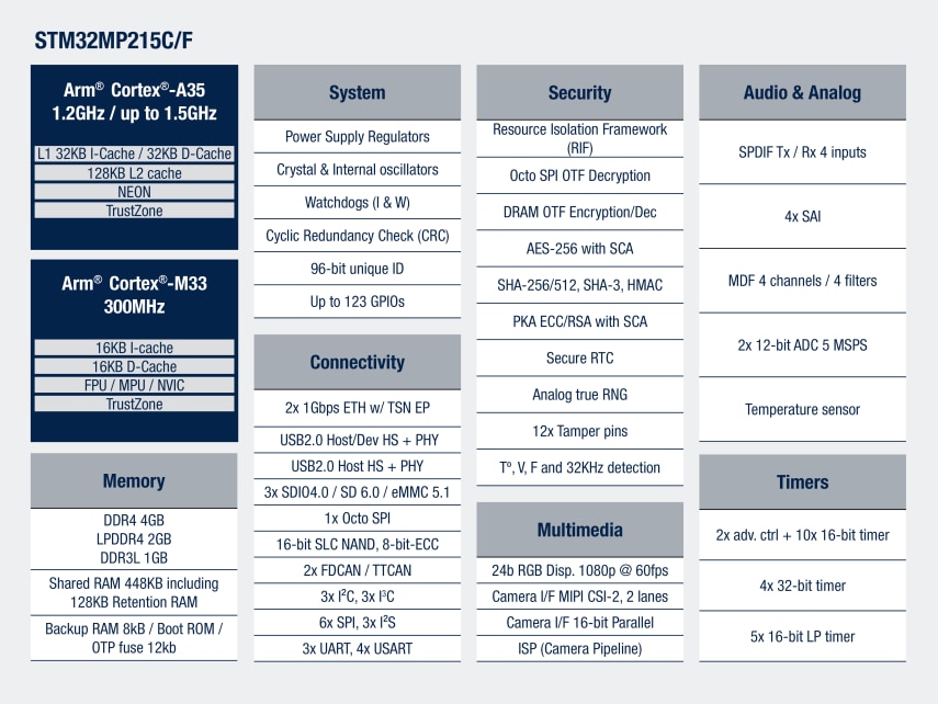 STM32MP21xC/F devices are based on the high-performance core Arm® Cortex®-A35 64-bit RISC core operating at up to 1.5 GHz. The Cortex®‑A35 processor includes a 32-Kbyte L1 instruction cache, a 32-Kbyte L1 data cache, and a 128-Kbyte L2 cache. The Cortex®‑A35 processor uses a highly efficient 8-stage in-order pipeline that has been extensively optimized to provide full Armv8-A features while maximizing area and power efficiency.