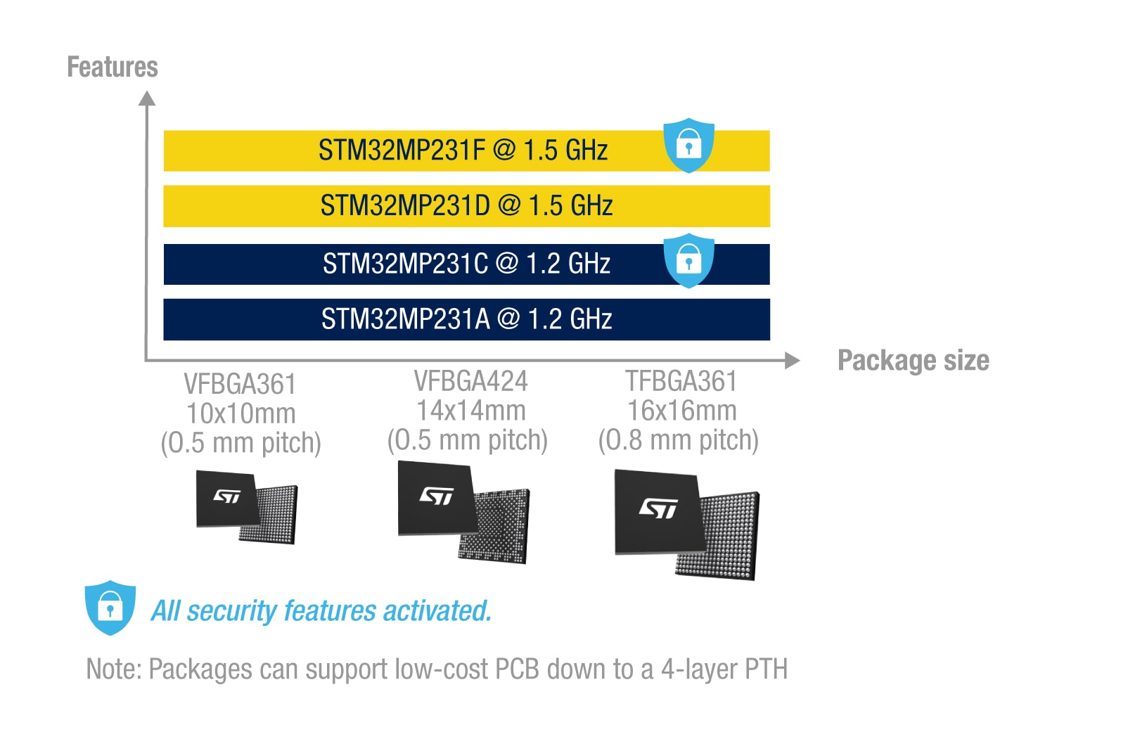 STM32MP231应用处理器 (STM32 MPU) 基于运行频率最高1.5 GHz的单核Arm® Cortex®-A35和运行频率为400 MHz的Cortex®-M33内核。