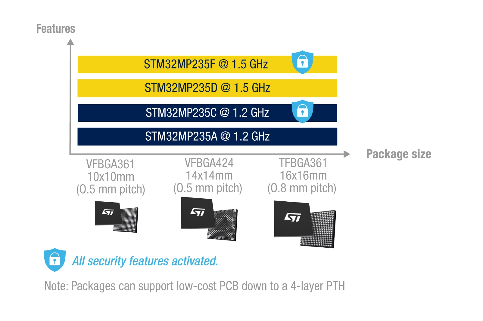 STM32MP235应用处理器 (STM32 MPU) 基于运行频率高达1.5 GHz的双Arm Cortex®-A35内核和运行频率为400 MHz的Cortex®-M33内核。