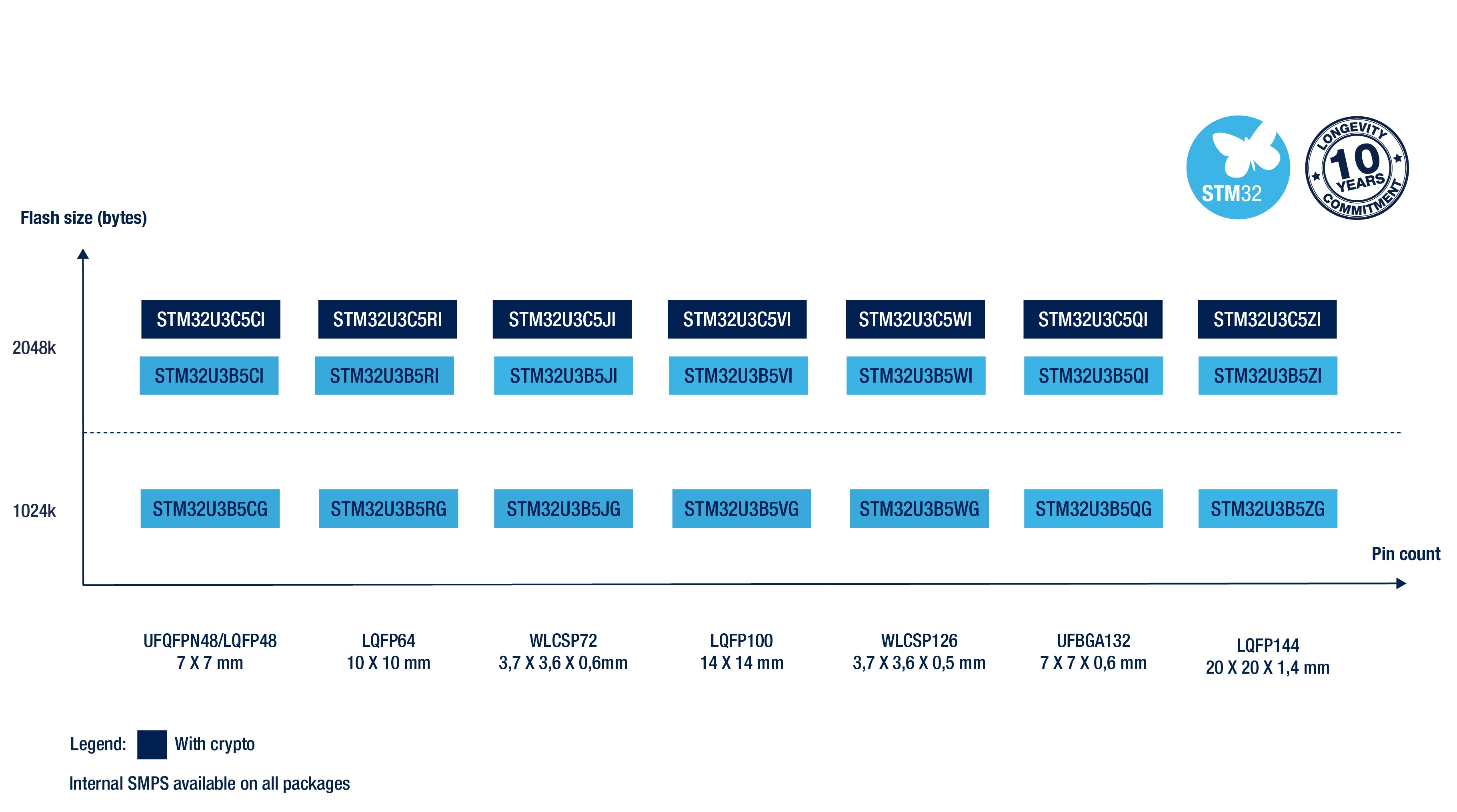 STM32U3B5/3C5系列基于Arm®Cortex®-M33内核,并配备扩展内存:640 KB的RAM和高达2 MB的双BANK存储区Flash。此外,该系列还集成了FDCAN和I3C IP,提供48引脚至144引脚的9种不同封装形式,包括UFQFPN、WLCSP、LQFP和UFBGA。