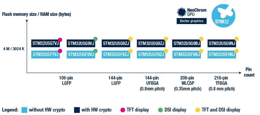 STM32U5F7和STM32U5G7提供LQFP-100引脚封装,并提供与STM32U5F9/U5G9相同的性能,具有TFT-RGB显示接口。