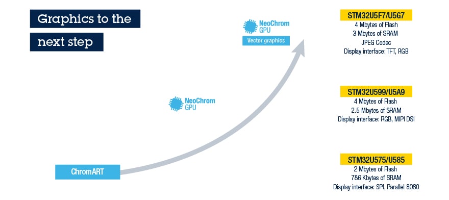 如今STM32U5F7和STM32U5G7集成了意法半导体推出的第二代图形处理单元NeoChromVG GPU。这款全新的图形加速器可帮助开发人员减少Flash的占用,同时可提供支持矢量的高性能GUI。