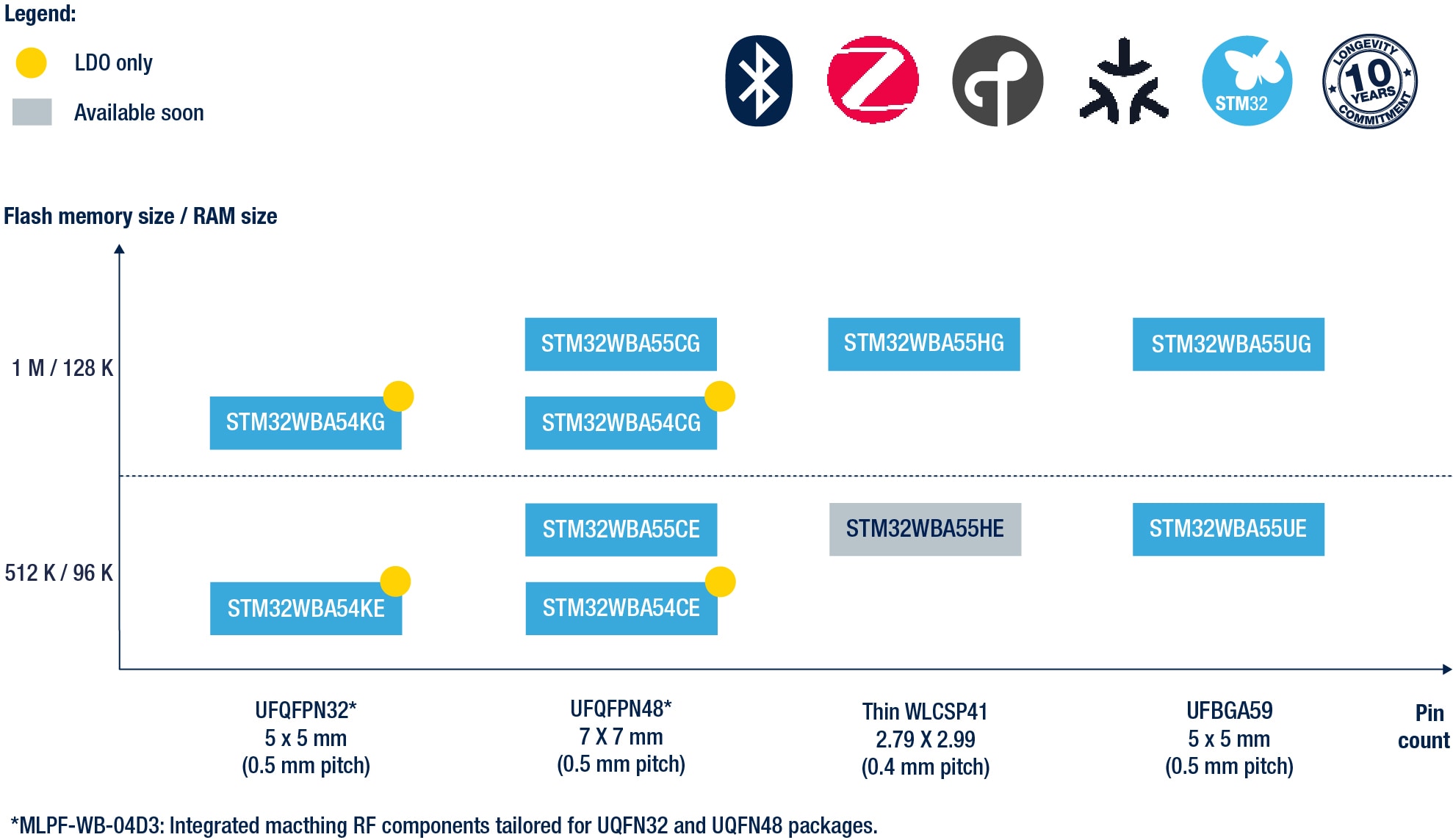 该系列提供高达100 MHz的CPU、1 MB Flash存储器和128 KB RAM,并采用4种封装:32引脚和48引脚的UFQFPN、41引脚的WLCSP和59引脚的UFBGA。