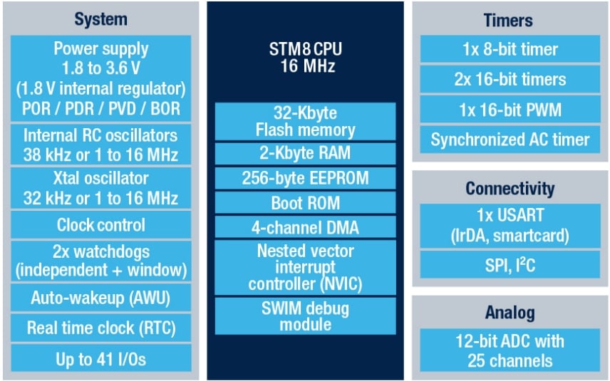All devices offer 12-bit ADC, real-time clock, 16-bit timers, one 8-bit timer as well as standard communication interface such as SPI, I2C, USART and 4x28-segment LCD. The 4x 28-segment LCD is available on the medium-density value line STM8L052C6.