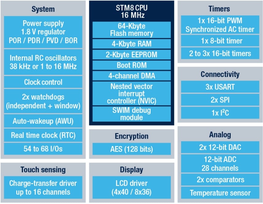 The devices incorporate an extensive range of enhanced I/Os and peripherals, a 12-bit ADC, two DACs, two comparators, a real-time clock, AES, 8x40 or 4x44-segment LCD, four 16-bit timers, one 8-bit timer, as well as standard communication interfaces such as two SPIs, an I2C interface, and three USARTs. The modular design of the peripheral set allows the same peripherals to be found in different ST microcontroller families including 32-bit families. This makes any transition to a different family very easy, and simplified even more by the use of a common set of development tools.
