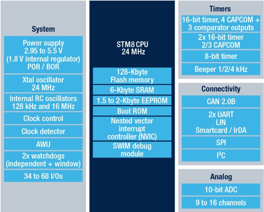 - Advanced STM8 core with Harvard architecture and 3-stage pipeline