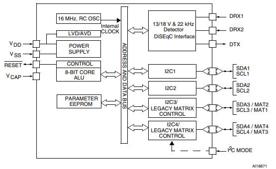 The STM8SPLNB1 is an 8-bit microcontroller dedicated to DiSEqC slave operation in SaTCR based LNBs (Low Noise Block) and switchers.