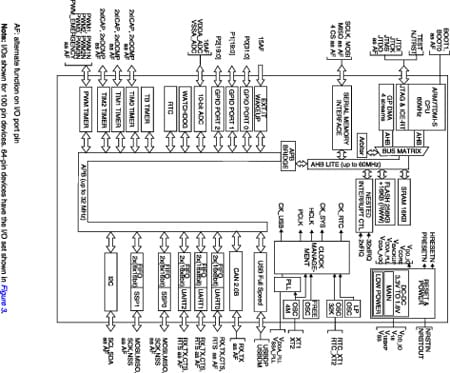 • 8 Communications interfaces1 I2C interface3 HiSpeed UARTs w. Modem/LIN capability2 SSP interfaces (SPI or SSI) up to 16 Mb/s1 CAN interface (2.0B Active)1 USB full-speed 12 Mb/s interface with 8 configurable endpoint sizes