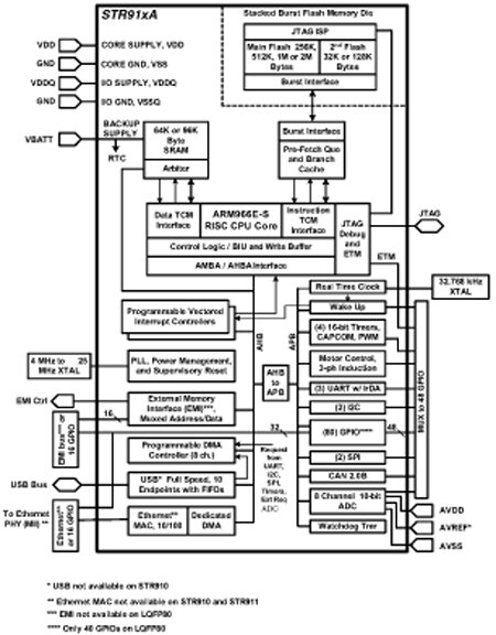- STR91xFA implementation of core adds high-speed burst Flash memory interface, instruction prefetch queue, branch cache