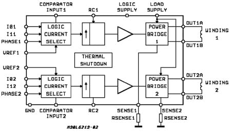 Wide range of current control from 750 mA (each bridge) is permitted by means of two logic inputs and an external voltage reference. A phase input to each bridge determines the load current direction. A thermal protection circuitry disables the outputs if the chip temperature exceeds safe operating limits.