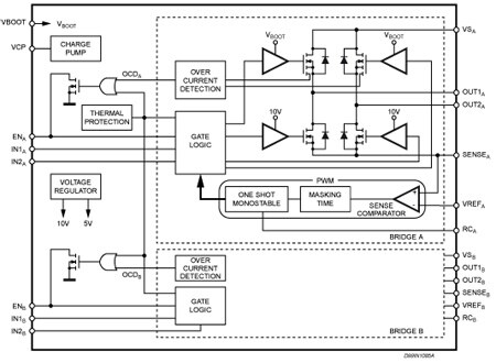 The L6227 device is a DMOS dual full bridge designed for motor control applications, realized in BCD technology, which combines isolated DMOS power transistors with CMOS and bipolar circuits on the same chip. The device also includes two independent constant off time PWM current controllers that performs the chopping regulation. Available in PowerSO36 and SO24 (20 + 2 + 2) packages, the L6227 device features a non-dissipative overcurrent protection on the high-side power MOSFETs and thermal shutdown.